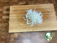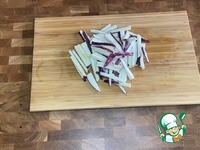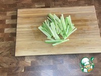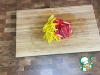 Куриное филе нарезать полосками. Добавить соль, перец и соевый соус. Перемешать. |