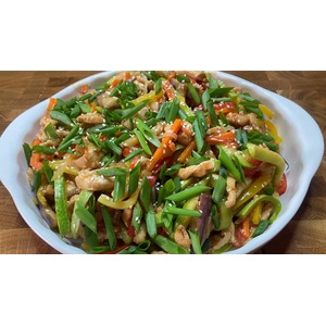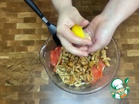 Готовые овощи и мясо перемешать. Добавить чеснок, соль, перец, сок лимона. Украсить перьями зеленого лука и кунжутом. |