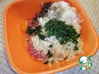Вбить одно яйцо. Лук натереть на крупной тёрке, чеснок мелко нарезать. Отправить в миску к остальным ингредиентам. |