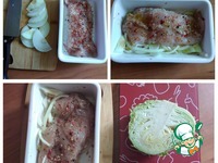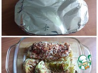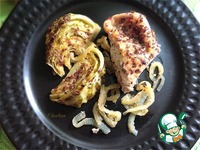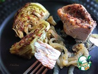 Описание: Пряная индейка замаринованная с луком, специями и запечённая с молодой капустой, порезанной четвертинками из половинки вилка.