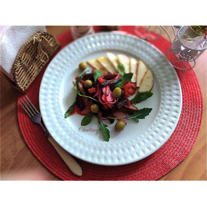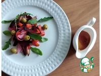 Описание: Салат из печёных свёклы и моркови со свежими овощами, яблоком, заправленный пикантной заправкой.