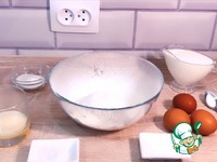 В отдельной емкости смешиваем сухие ингредиенты: 200 грамм муки, 1/5 чайной ложки соли и 1 чайную ложку разрыхлителя. |