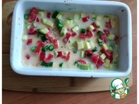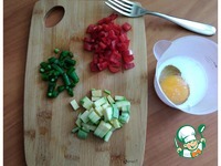 Овощи режем мелким кубиком. Готовим заливку. В кружке смешала яйцо со сливками, немного присолила. |