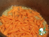 В казане или утятнице разогреть масло, обжарить мелко нарезанный лук до прозрачности, затем добавить морковь, нарезанную брусочками и обжарить её до мягкости. |