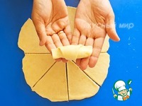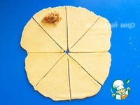 Выложите ореховую начинку, как показано на фото. Мне пришлось ее чуть уменьшить, чтобы аккуратно свернуть рулетики, так что не перестарайтесь с количеством. |