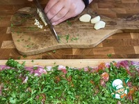 Чеснок нарезать мелкими кубиками и тоже выложить на мясо. |