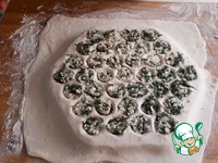 Накрываем начинку пластом теста толщиной 3 мм. Немного придавливаем руками. Осторожно прокатываем скалкой. |