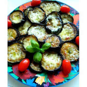 Тонко нарезать моцареллу. Вытащить противень и выложить сыр на баклажаны. Запекаем пока сыр не расплавится и чуток зазолотится. |