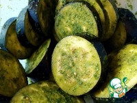 Перемолоть в блендере базилик вместе с маслом, солью и чёрным перцем. Смешать вместе с баклажанами и дать промариноваться 30 минут. |