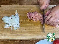 Лук нарезать мелкими кубиками. Куриное филе небольшими кусочками. |