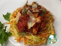 Описание: Сочное куриное филе в томатном соусе и хрустящая паста из кабачка и моркови. Сочно и вкусно. Готовится все это буквально за минуты. Легкий и полезный обед или ужин. Понравится не только тем, кто следит за фигурой.