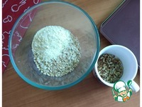 Овсяные хлопья, муку кукурузную помещаем в посуду, где будем замешивать тесто. Для печенья я возьму семена льна и семечки подсолнуха. Можно взять любые семечки, а так же кунжут. |