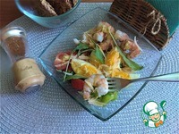 Поливаем салат заправкой прямо перед подачей и украшаем немного листьями рукколы. |