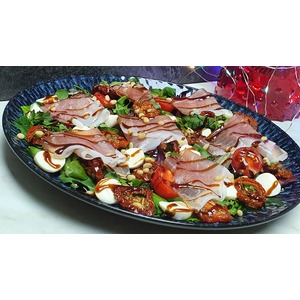 Описание: Салат готовится очень быстро и просто. Имеет отличное сочетание моцареллы, вяленого окорока и двух видов томатов, которое дополняет тонкий аромат чеснока. Очень вкусно! Попробуйте и вы...