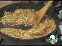Кабачок у меня молодой, без семечек. Я кожуру не обрезала, натерла на крупной терке. Добавляем в соус, перемешаем и тушим 10 минут. |