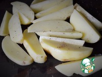 Картофель вымыть, почистить, нарезать ломтиками, обсушить, посолить и смешать с растительным маслом. |