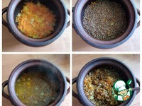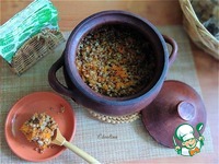 Берём глиняный горшок. У меня горшок чернолощённой керамики - экологически 100 % чистый продукт. Очень вкусная еда получается в глиняной посуде непокрытой глазурью. Выкладываем на низ овощи, на овощи рассыпаем гречку и заливаем горячим солёным куриным бульоном. Ставим горшок в духовку на 50 минут примерно, выставив Т-180 С. Через 20 минут, когда в горшке бульон закипит, убавляем температуру до Т-130-150 С. За 10 минут до готовности каши, вынимаем горшок и перемешиваем содержимое, опять отправляем в духовку. Даём каше упреть. Ориентируйтесь на свою духовку! |