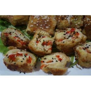 6. Рулет обвалять в кляре ( для этого смешать яйцо, молоко, соль и сахар) и обжарить на подсолнечном масле с обеих сторон.