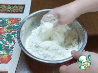 Добавляем 80 г мягкого сливочного масла и лёгкими движениями растираем тесто в крошку. |