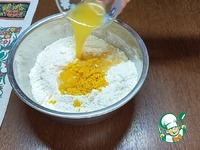 Предварительно я приготовила цедру с одного апельсина и с этого же апельсина у меня получилось 80 мл свежевыжатого сока. Добавляем в крошку одно среднее яйцо, цедру и апельсиновый сок. |