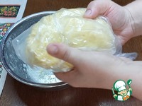 Замешиваем тесто. Оно должно получиться мягким и эластичным, даже слегка воздушным. Перекладываем его в пакет или оборачиваем пищевой плёнкой и отправляем в холодильник минут на 25-30. |