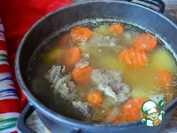 Мясо промыть, залить холодной водой, добавить коренья, репчатый лук ( в шелухе) и половину моркови, дать закипеть, удалить пену и варить 1,5 - 2 часа, минимальный огонь, слабое кипение. |