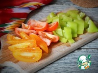 Перец и помидоры нарезать и добавить в казан с сахаром, варить 10 минут. |
