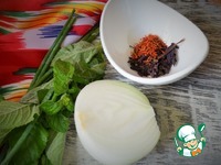 Мяту и лук вымыть, обсушить. Смешать шафран и райхон (сушёный базилик). |