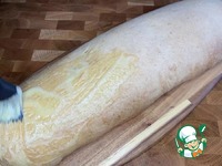 Выложить рулет на противень (противень застелить бумагой и смазать растительным маслом). Убрать рулет в холодильник на 1,5 часа. |