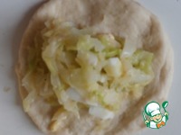 Формуем пирожки: Поднявшееся тесто обминаем и делим на небольшие кусочки. Из кусочка делаем лепешку и кладем туда чуть меньше ст. л. начинки. |