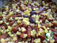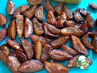 Для начинки у меня была замороженная слива. Разрезать на дольки. Вес примерный, но покрыть надо всю поверхность пирога. |