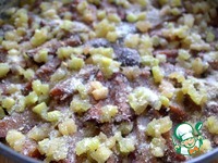 Воткнуть в тесто дольки сливы по всей поверхности и сверху насыпать ревень. Крупные кусочки ревеня тоже слегка втопить в тесто. |