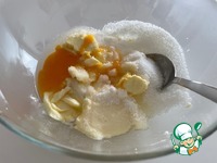 Для теста: берем мягкое сливочное масло, добавляем сахар, яйцо и гасим в 1 столовой ложке уксуса чайную ложку соды. Перемешиваем. Стакан для всех ингредиентов у меня 200 мл. |