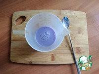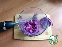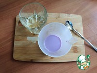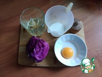 Через 2 слоя марли отожму сок в молоко. Нам нужно для 1 яйца 25 мл молока и 25 мл сока. Удобно пользоваться мерным стаканом. Смесь вначале будет фиолетовой. |