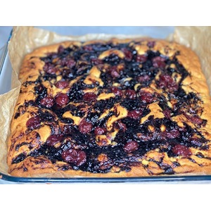 Выкладываем в форму застеленную пергаментной бумагой, разравниваем, сверху выкладываем повидло и деревянной шпажкой или вилкой растягиваем по поверхности, немного углубляя вниз. Выкладываем оставшиеся вишни и отправляем в духовку, разогретую до 180 градусов, на 35 минут.