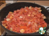 Помидоры помыть, нарезать крупным кубиком, отправить в сотейник или кастрюлю с толстым дном. Накрыть крышкой и тушить на среднем огне 15 минут, чтобы они пустили сок и стали мягкими. |