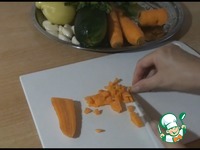 Пока помидоры тушатся подготовим остальные овощи, морковь нарежем кубиком помельче, а кабачок и перец таким же крупным кубиком как помидоры. |