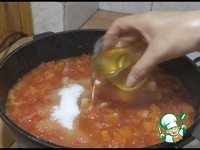 К помидорам добавляем соль, сахар, вливаем растительное масло, перемешаем. |