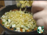 Потом добавляем кабачок и перец, перемешаем и продолжаем тушить под крышкой ещё 20 минут. |