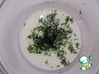Для клёцок в кефир всыпать соль и мелко нарезанный укроп. |