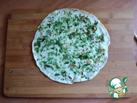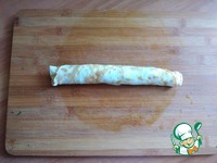 Скручиваем в очень плотный рулетик. Из количества этого теста я выпекла 2 блина D-24 см. |