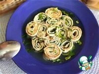 Берём суповую тарелку для подачи и на дно красиво укладываем "спиральки" нарезанного блина или просто полоски блина. |