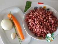 Первым делом нужно замочить фасоль на ночь. Утром воду слить, фасоль промыть. Морковь, лук и чеснок почистить. |