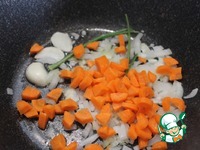 В толстостенной кастрюле разогреть масло, добавить разрезанный пополам зубчик чеснока, немного прогреть. Всыпать нарезанные лук и морковь. Жарить минут 7-10, помешивая. |