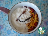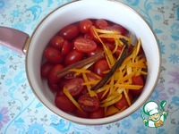 В помидоры черри добавьте лимонный сок, цедру апельсина, палочку корицы и стручок ванили. |