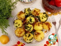 Картофель натереть на крупной тёрке. Именно натереть, а не размять! Добавить желток, специи, посолить по вкусу. Я использую приправу "Кухарек ". |