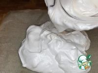Посыпать корж миндальными лепестками. Выпекать меренгу при температуре 120-130 градусов примерно 1,5-2 ч. в зависимости от духовки. |