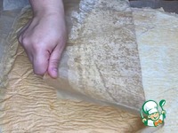 Корж перевернуть на бумагу для запекания. Бумагу на которой выпекалась меренга-снять. Дать остыть. |