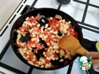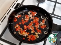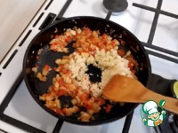 Добавляем мякоть кабачка и нарезанный помидор. Жарим еще около 5 минут. |