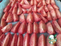 Помидоры посыпаете солью, немножко, но нужно обязательно, при этом плоды быстрее обезвоживаются и гарантированно не закиснут. Рекомендую еще и слегка сахаром посыпать, не самые сладкие у нас помидоры.
